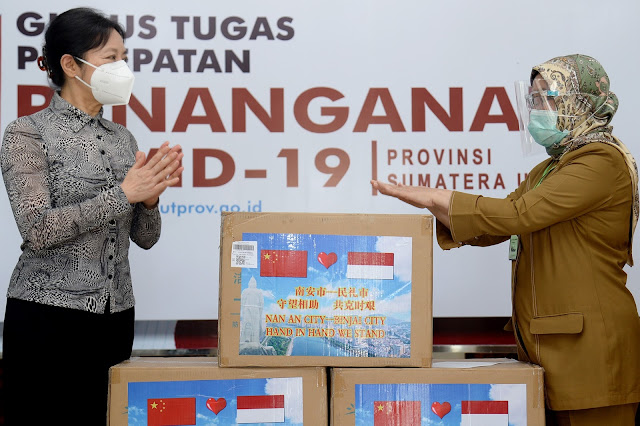 MEDIASELEKTIF.COM – Sekretaris Daerah Provinsi Sumatera Utara (Sekdaprovsu) R Sabrina menerima bantuan penanganan Covid-19 berupa 30.000 buah masker bedah medis sekali pakai dari Nan An Municipal People’s Government Tiongkok, Senin (13/7/2020), di Posko Gugus Tugas Percepatan Penanganan (GTPP) Covid-19 Sumut, Jalan Sudirman Nomor 41 Medan. Puluhan ribu masker tersebut akan diserahkan kepada GTPP Covid-19 Binjai selaku Kota Kembar dari Kota Nan An.